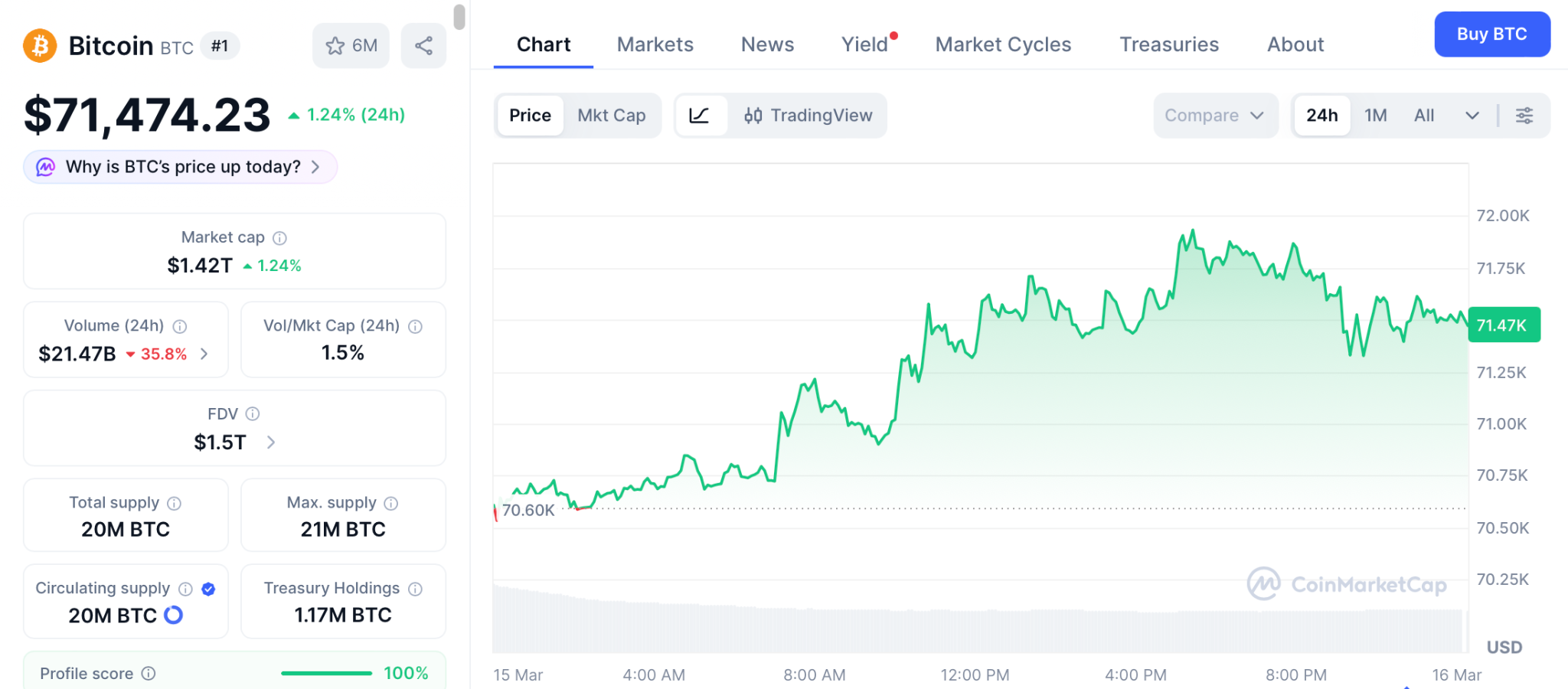 BTC diperdagangkan berhampiran $71,474 menurut CoinMarketCap dengan dominasi pada 56.9% dan ETF spot menyerap $1.7 bilion dalam aliran masuk Mac. Ramalan harga bitcoin menyasarkan rintangan $74,500 dengan $85,000 yang mungkin jika pembelian institusi berterusan.